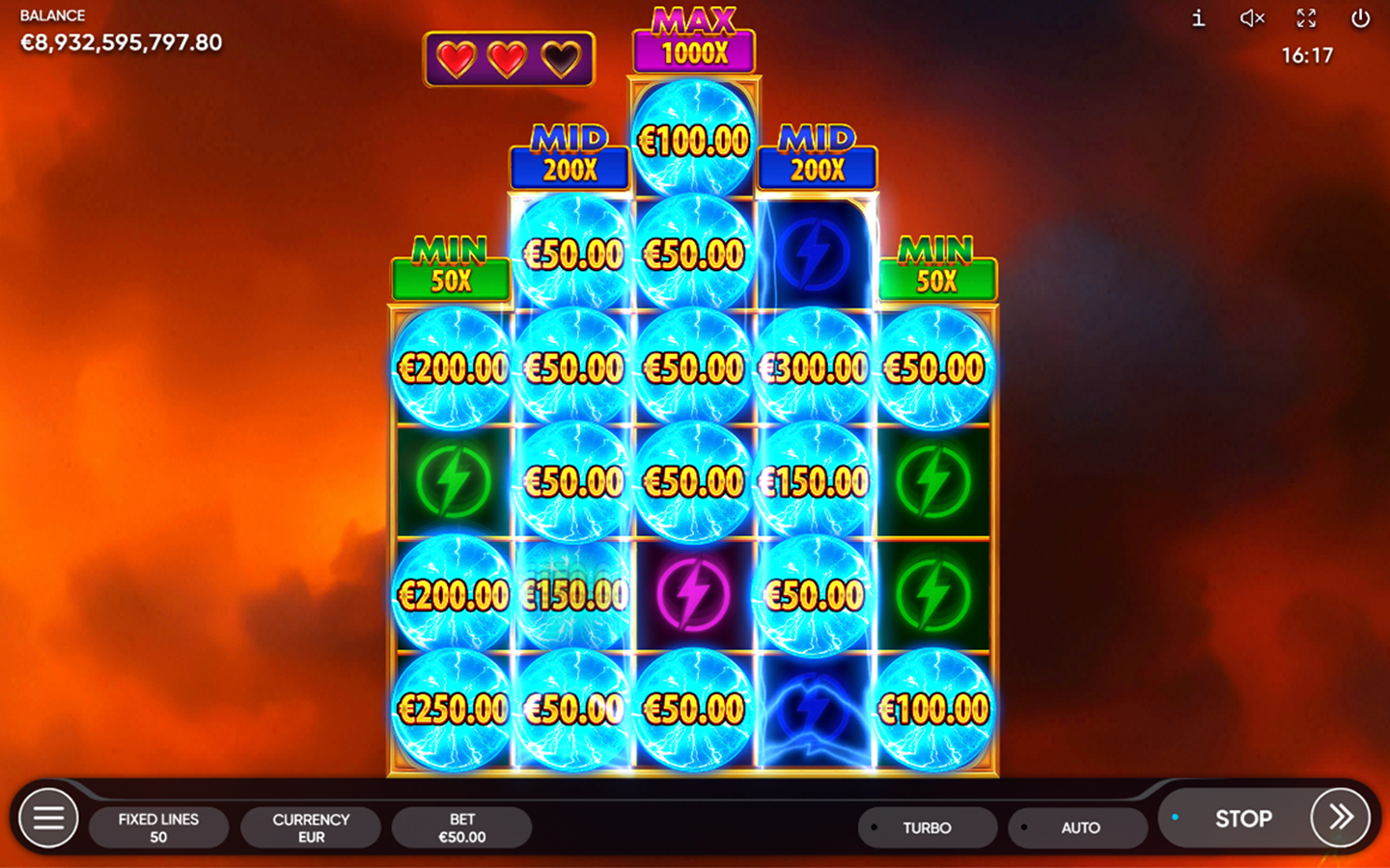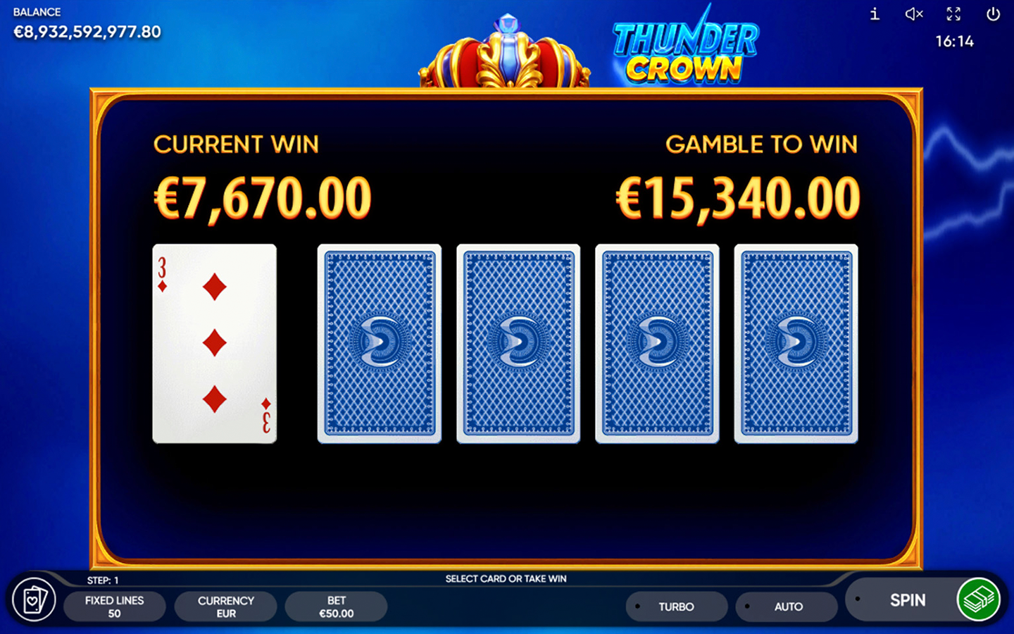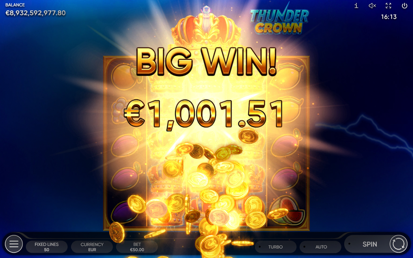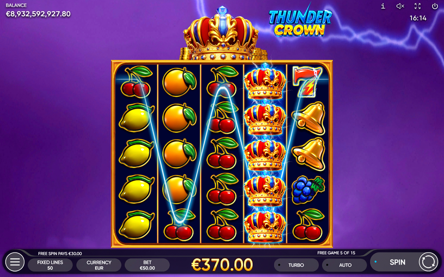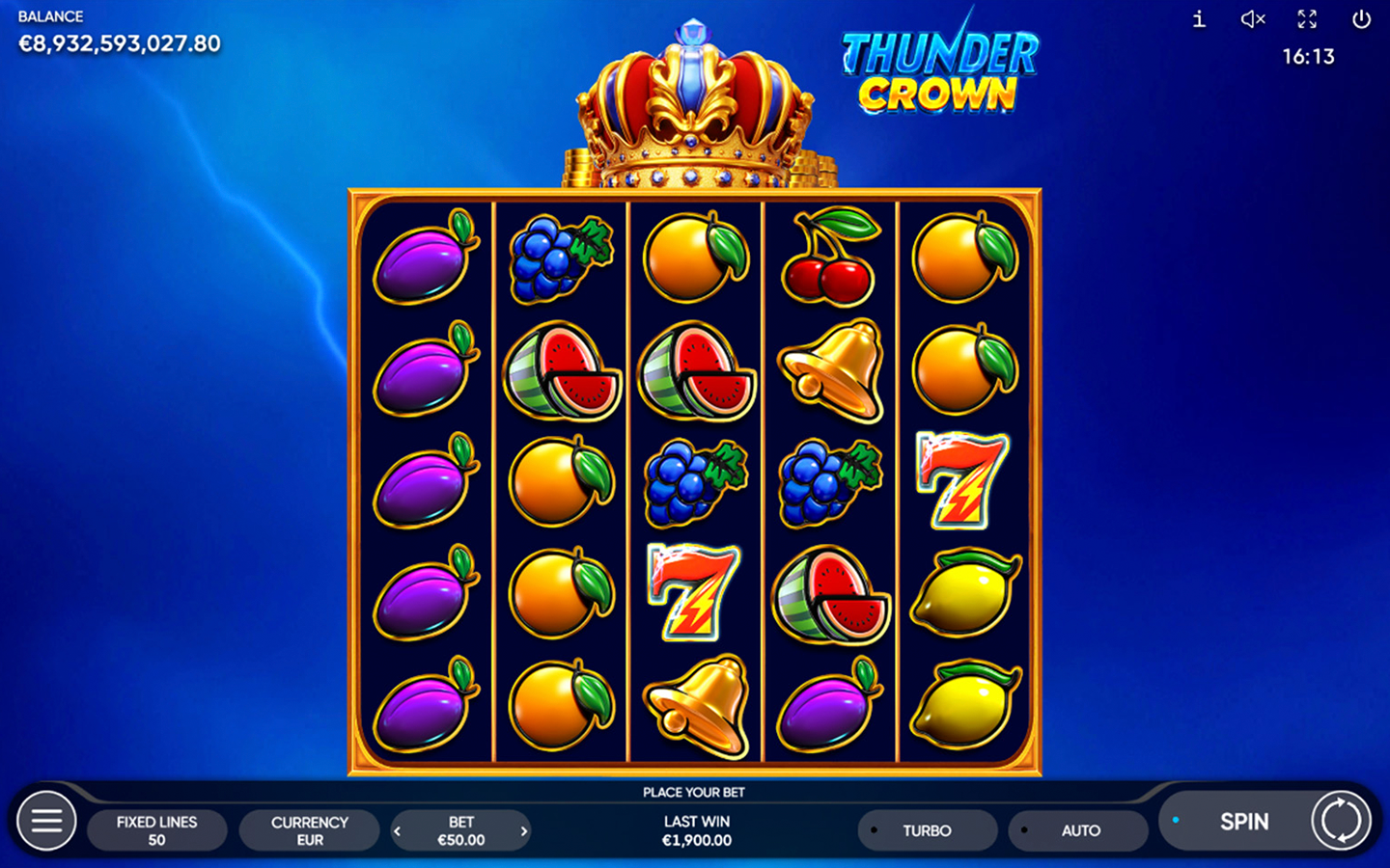 Bright fruits, glowing sevens, and stars spin on the reels as blue sparks dance at the edges of this 5-reel 5-row slot game with 50 fixed paylines. When the Crown appears, the sky deepens to mystical purple, thunder roars, and the storm’s energy bursts forth. The Crown substitutes for all symbols, except Scatter and Token.